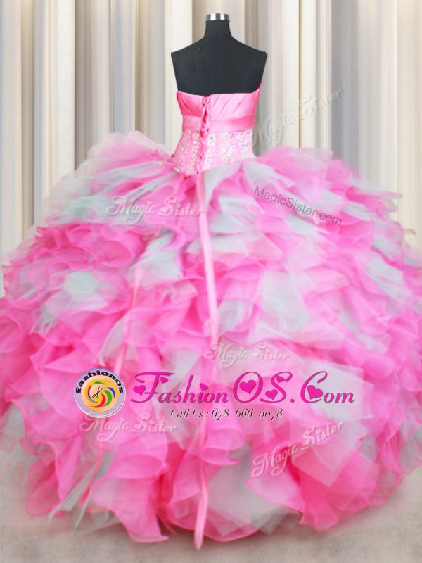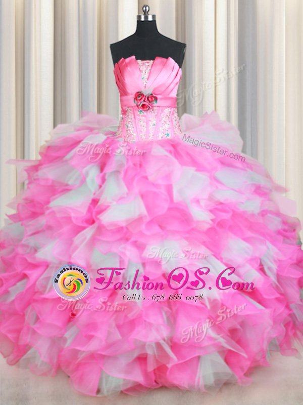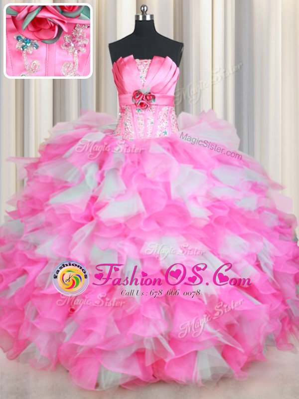 Strapless Sleeveless Sweet 16 Dress Floor Length Beading and Ruffles and Hand Made Flower Pink And White Organza and Tulle