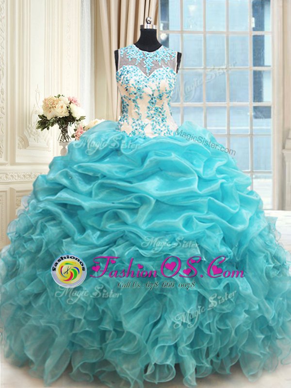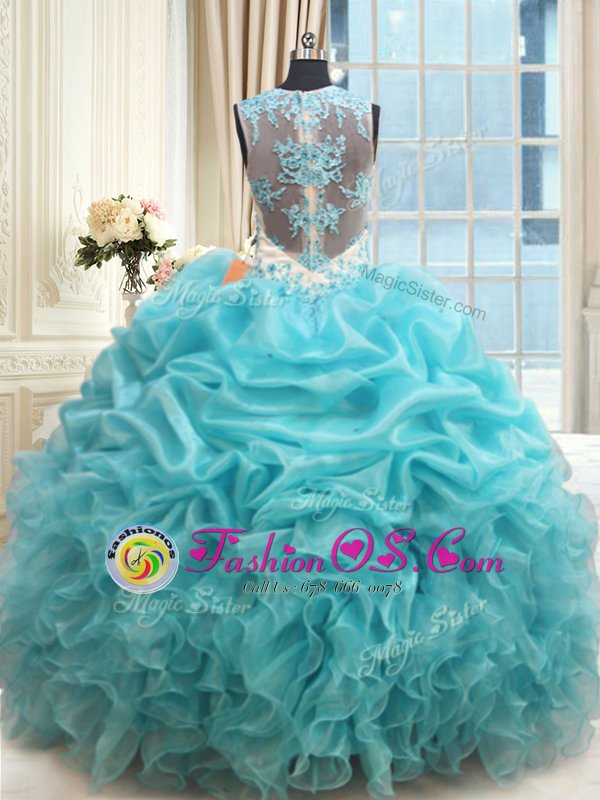 Scoop Organza Sleeveless Floor Length Sweet 16 Quinceanera Dress and Appliques and Ruffles and Pick Ups