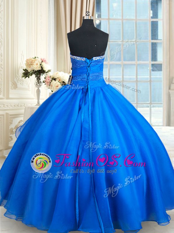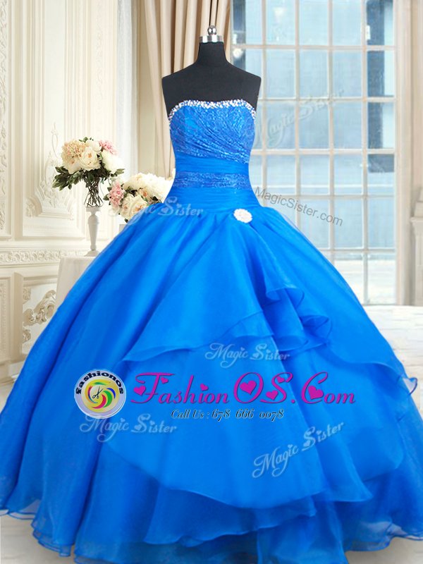 Blue Organza Lace Up Strapless Sleeveless Floor Length Quince Ball Gowns Court Train Beading and Lace and Sequins