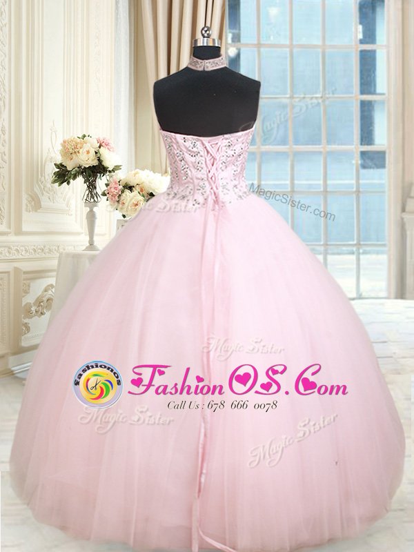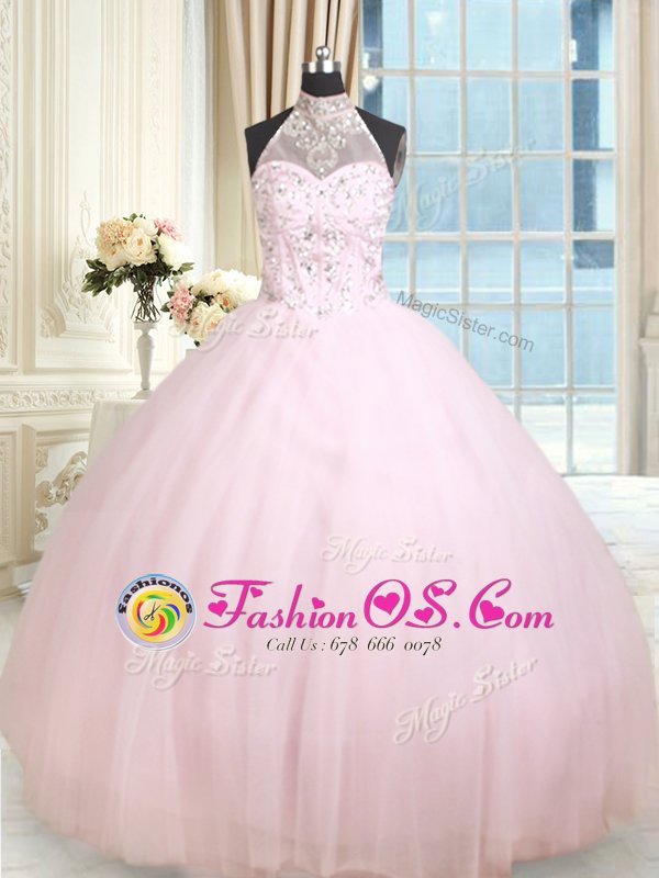 Baby Pink Lace Up Halter Top Beading Sweet 16 Dress Tulle Sleeveless