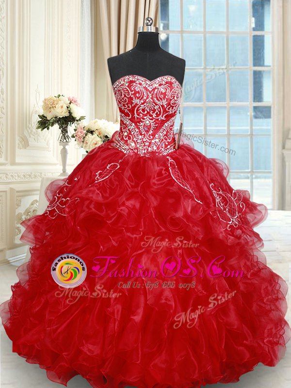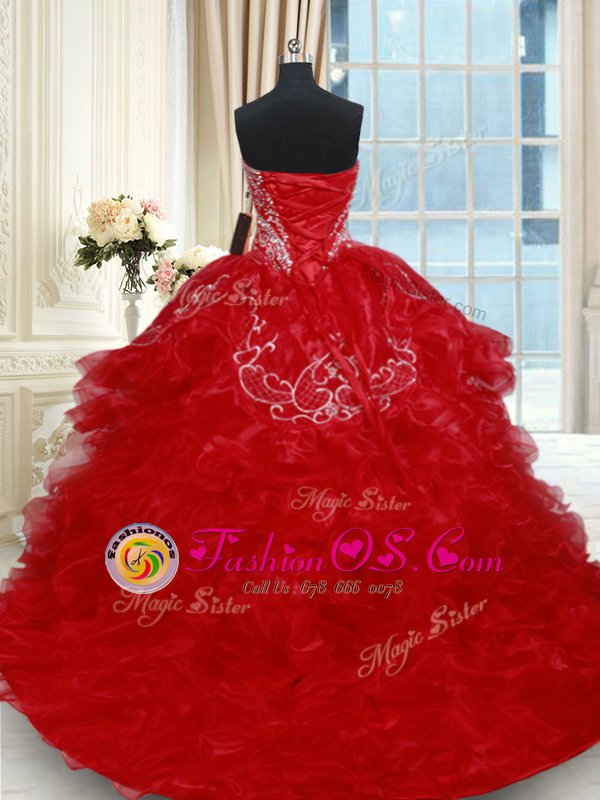 Sleeveless Organza Brush Train Lace Up Sweet 16 Quinceanera Dress in Red for with Beading and Embroidery and Ruffled Layers