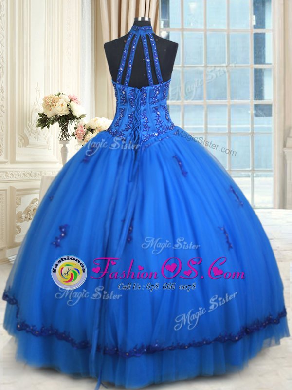 Hot Selling See Through Floor Length Blue Quinceanera Gown Halter Top Sleeveless Lace Up