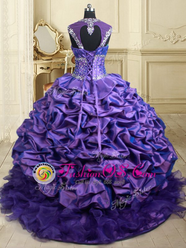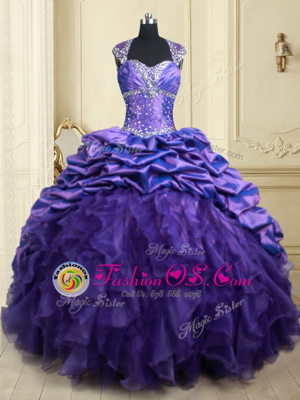 Pick Ups Brush Train Ball Gowns Quince Ball Gowns Purple Straps Organza and Taffeta Cap Sleeves Lace Up