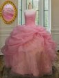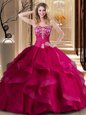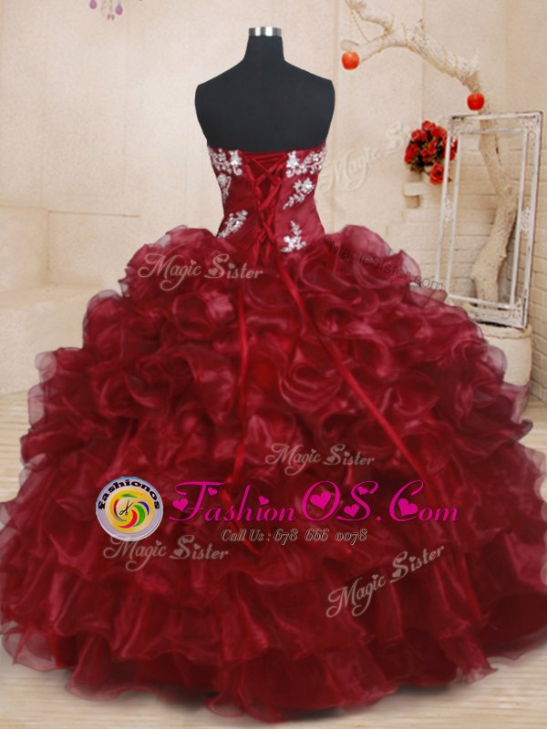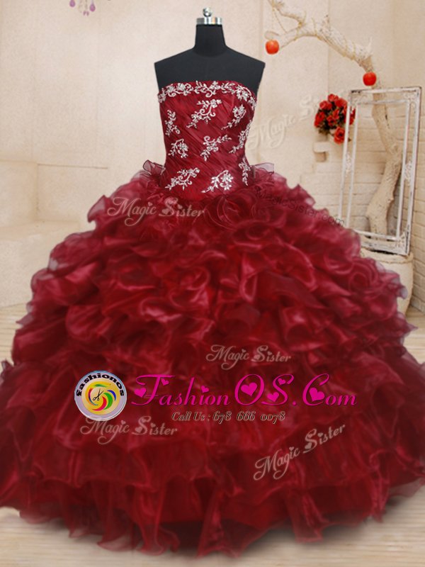 Edgy Burgundy Ball Gowns Strapless Sleeveless Organza Floor Length Lace Up Beading and Ruffles and Ruffled Layers Quince Ball Gowns