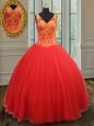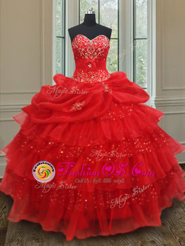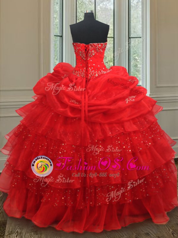 Sequins Pick Ups Ruffled Red Sleeveless Organza Lace Up Quinceanera Gowns for Military Ball and Sweet 16 and Quinceanera