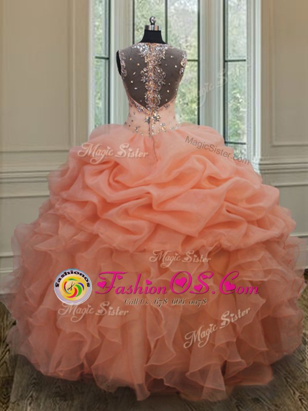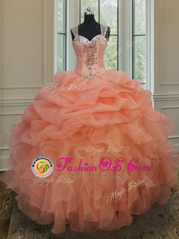 Orange Straps Neckline Beading and Ruffles and Pick Ups Quince Ball Gowns Sleeveless Zipper