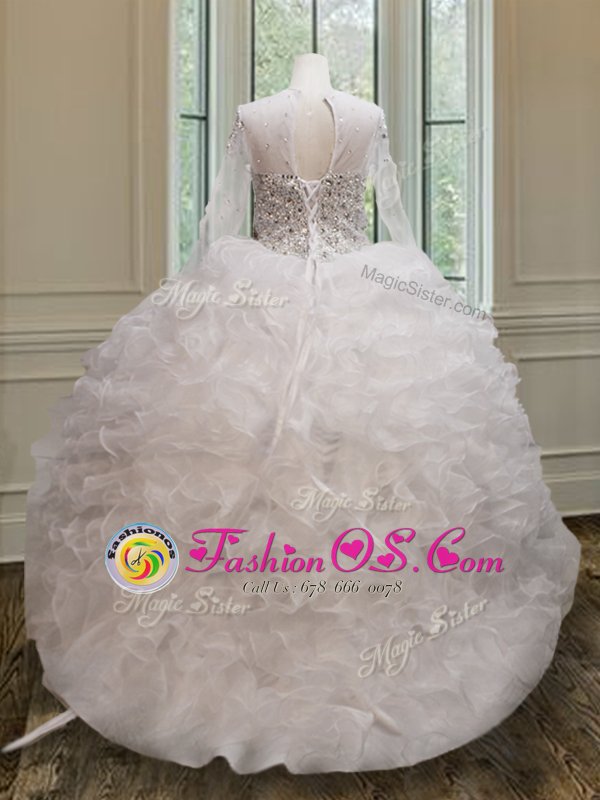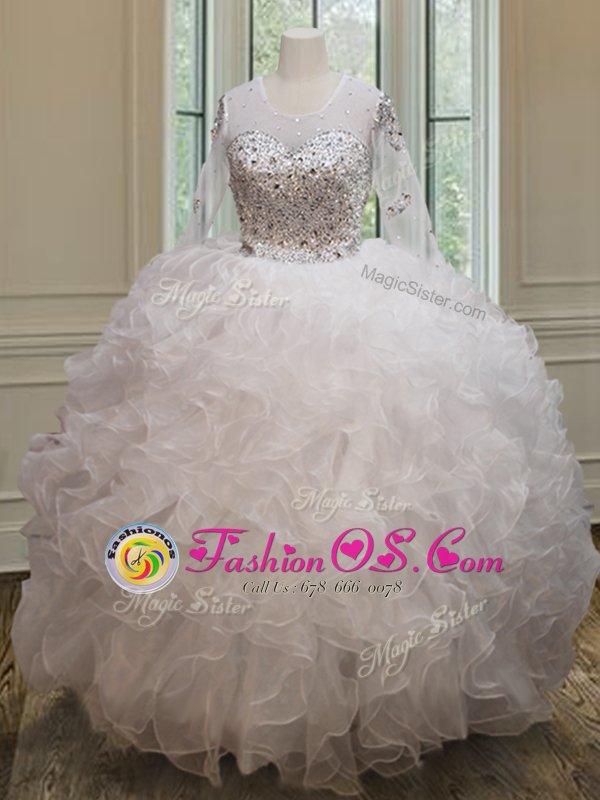 Dynamic Scoop See Through White Ball Gowns Beading and Ruffles Quinceanera Dresses Lace Up Organza Long Sleeves Floor Length