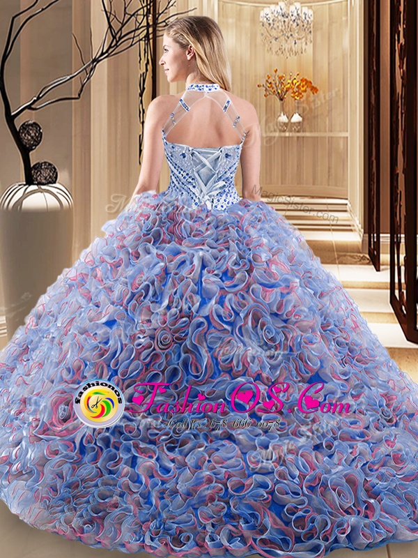 Flirting Halter Top Sleeveless Fabric With Rolling Flowers Quince Ball Gowns Beading Brush Train Lace Up