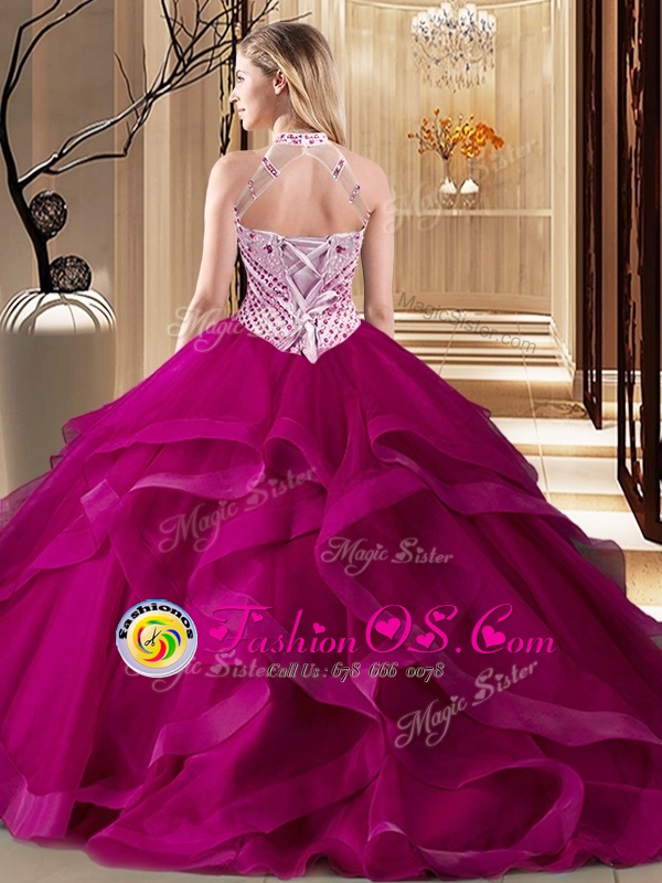 Halter Top Dark Green Sleeveless Brush Train Beading and Ruffles With Train Quinceanera Dress
