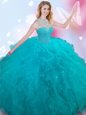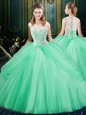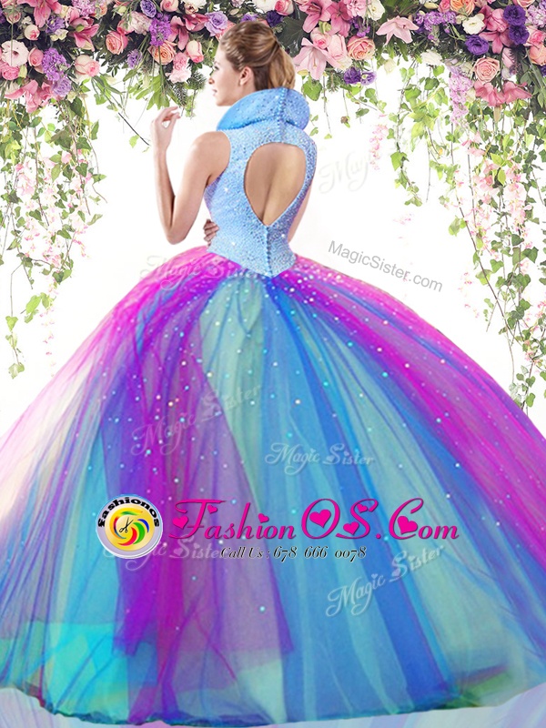 Lovely Halter Top Sleeveless Quince Ball Gowns Floor Length Beading and Lace and Appliques and Pick Ups Fuchsia Taffeta