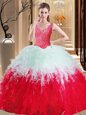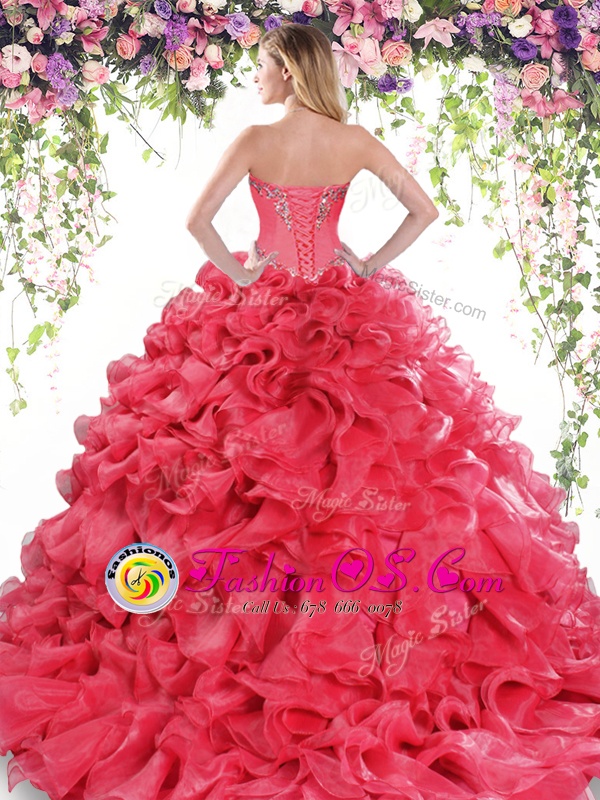 Sexy Sleeveless Beading and Ruffles Lace Up Quinceanera Gowns with Red Sweep Train