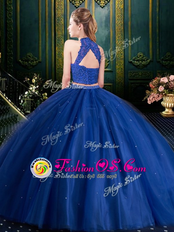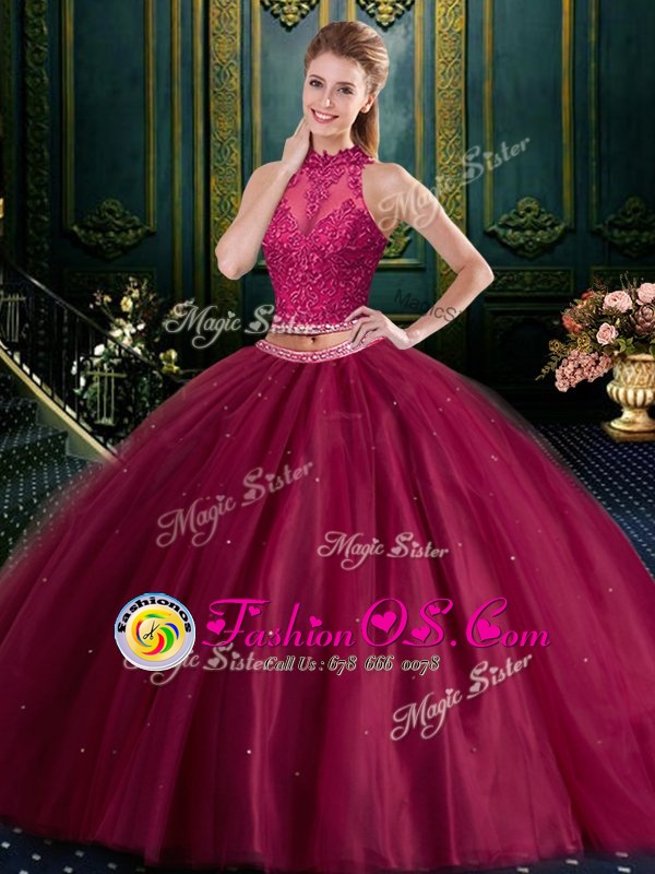 Halter Top Sleeveless Floor Length Appliques Lace Up Quinceanera Gowns with Burgundy