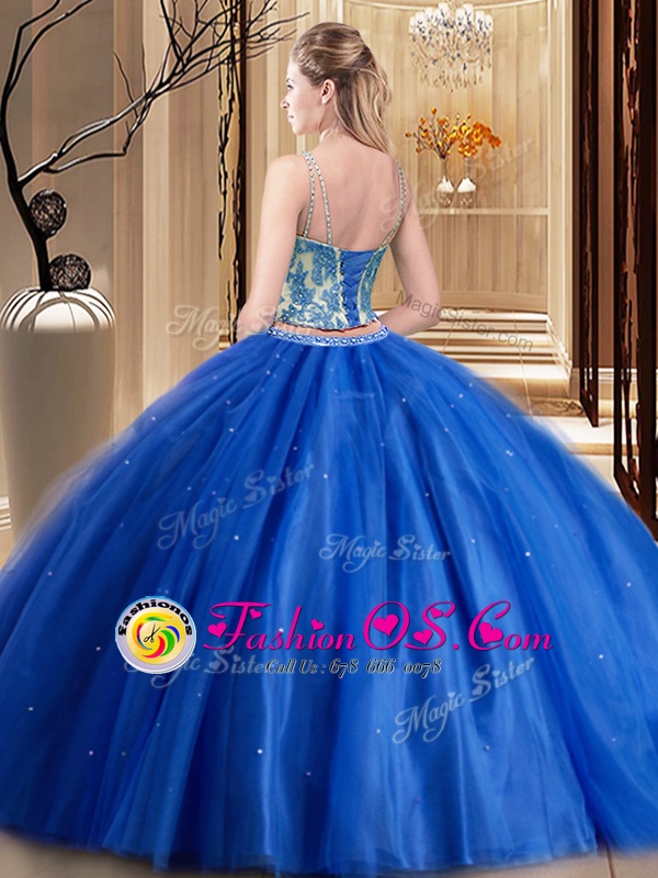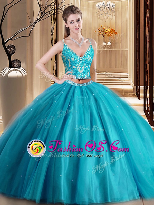 Teal Two Pieces Spaghetti Straps Sleeveless Tulle Floor Length Lace Up Beading and Lace and Appliques Vestidos de Quinceanera