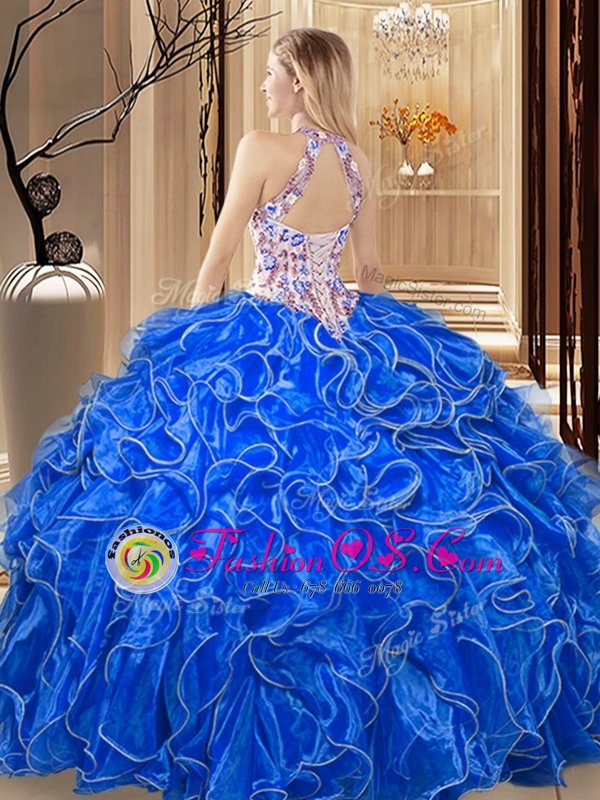 Teal Organza Backless Scoop Sleeveless Floor Length 15th Birthday Dress Embroidery and Ruffles