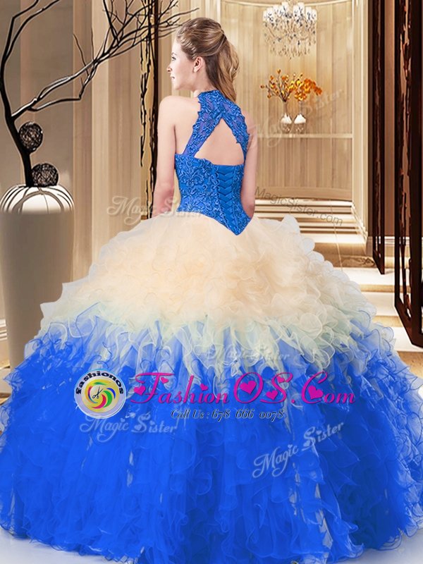 Beauteous Backless Organza Sleeveless Floor Length Ball Gown Prom Dress and Lace and Appliques and Ruffles