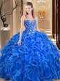 Comfortable Blue And White Quince Ball Gowns Military Ball and Sweet 16 and Quinceanera and For with Lace and Appliques and Ruffles High-neck Sleeveless Backless