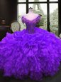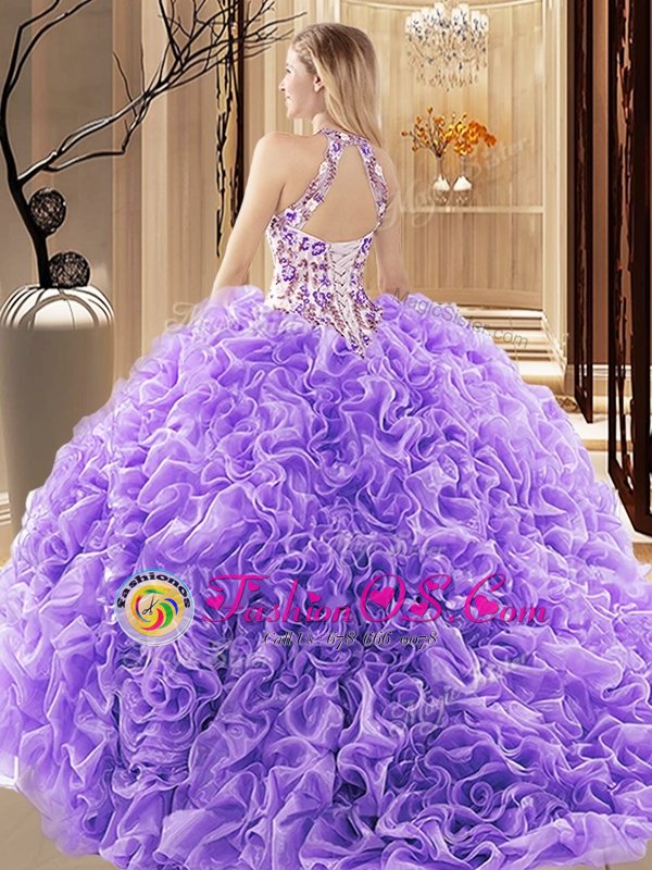 High Quality Sleeveless Embroidery and Ruffles Backless 15th Birthday Dress with Lavender Brush Train