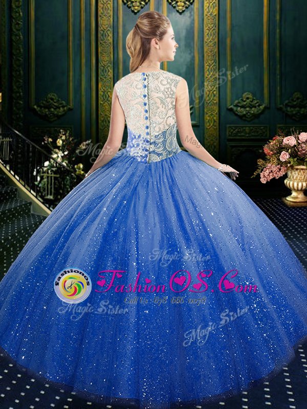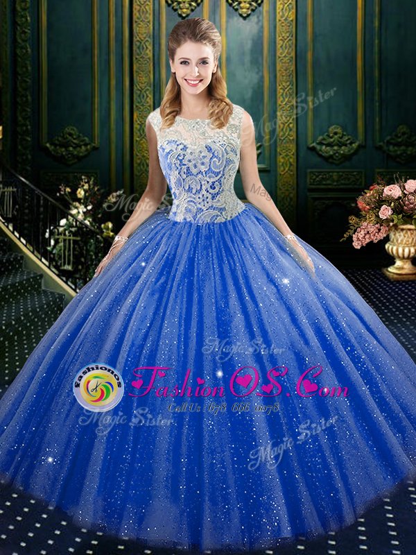 Royal Blue Zipper High-neck Lace Ball Gown Prom Dress Tulle Sleeveless