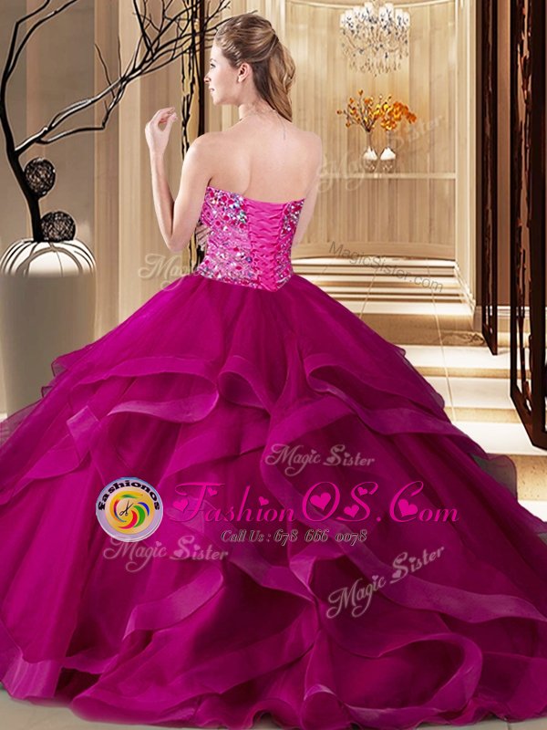 Floor Length Fuchsia Quinceanera Dresses Tulle Sleeveless Beading and Ruffles