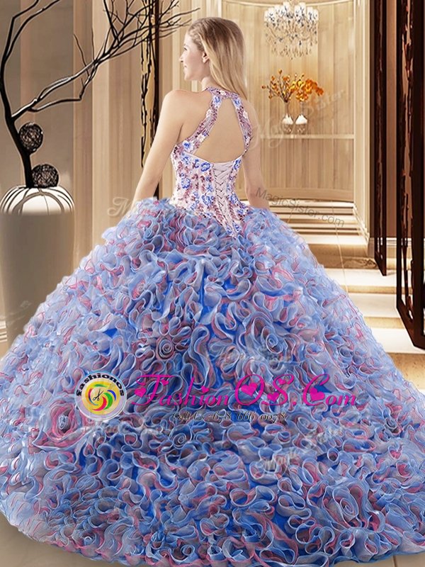 Classical Multi-color Sleeveless Fabric With Rolling Flowers Brush Train Criss Cross Quinceanera Dress for Military Ball and Sweet 16 and Quinceanera