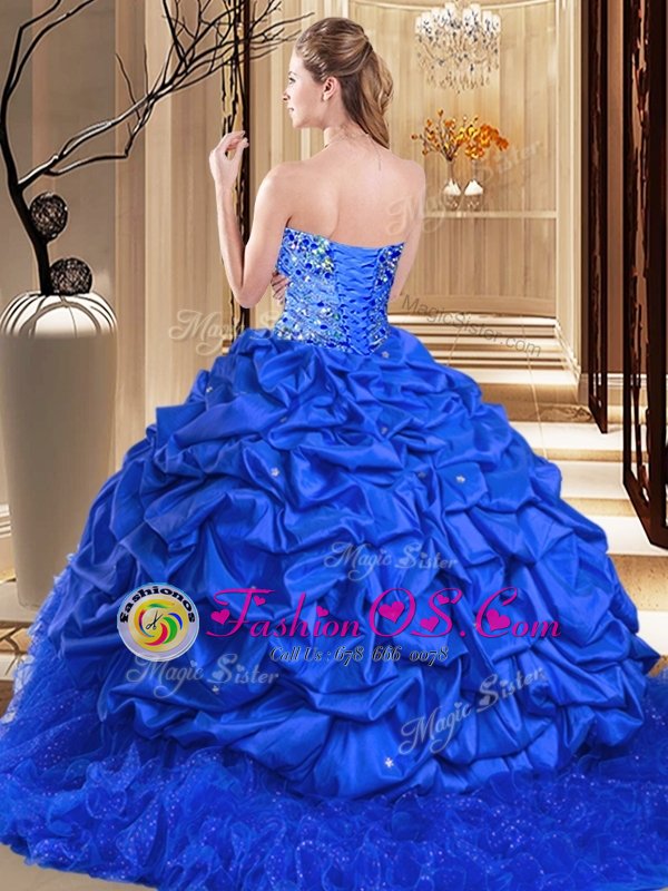 Dramatic Royal Blue Ball Gowns Sweetheart Sleeveless Taffeta and Tulle Brush Train Lace Up Beading and Ruffles Quinceanera Gown