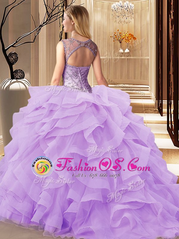 Light Blue Ball Gowns Tulle Scoop Sleeveless Beading and Ruffles Lace Up 15 Quinceanera Dress Brush Train