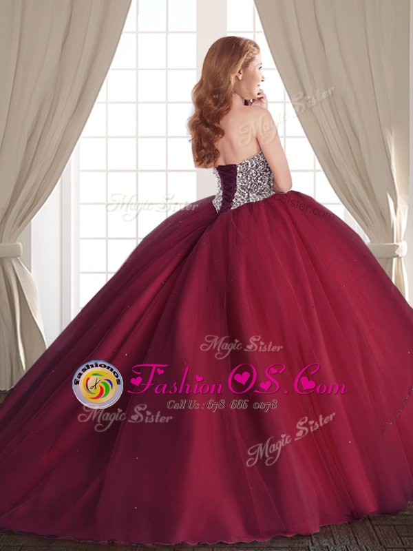 Designer Beading Sweet 16 Dresses Burgundy Lace Up Sleeveless With Brush Train