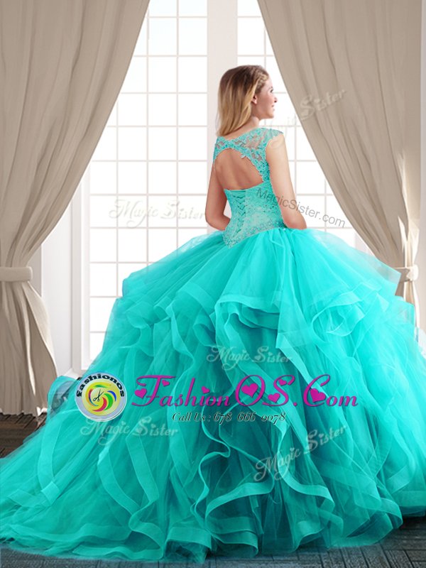 Delicate Scoop Tulle Cap Sleeves With Train Quinceanera Gown Brush Train and Beading and Appliques and Ruffles