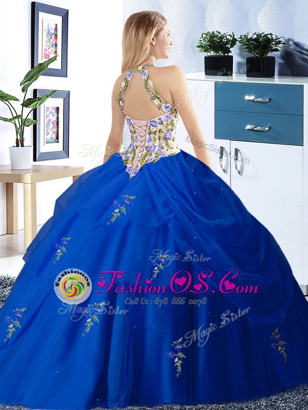 Exquisite Halter Top Sleeveless Floor Length Embroidery and Pick Ups Lace Up Sweet 16 Quinceanera Dress with Orange