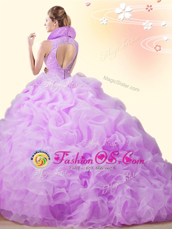 Modern Pick Ups High-neck Sleeveless Brush Train Backless Quinceanera Dress Lavender Organza