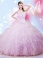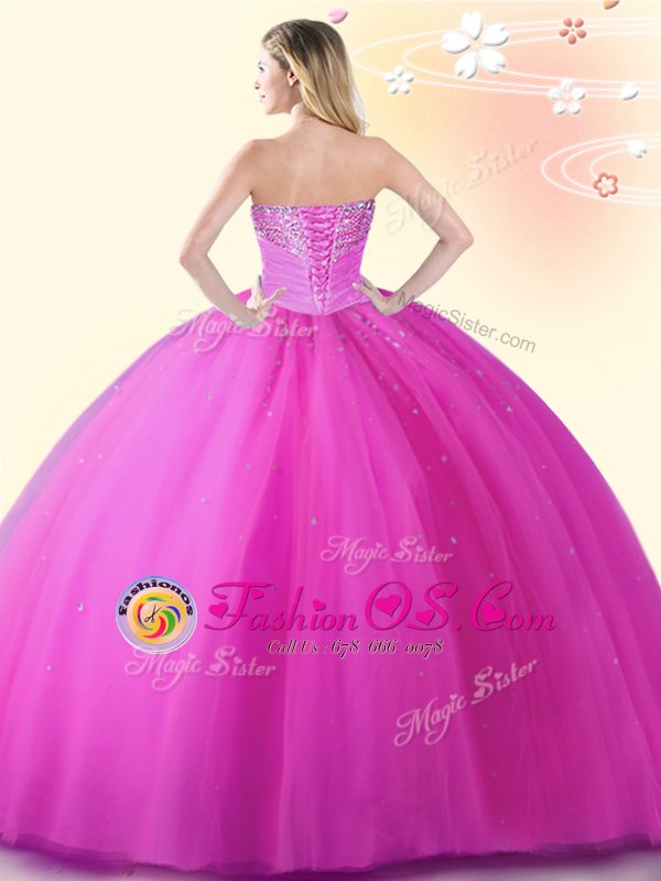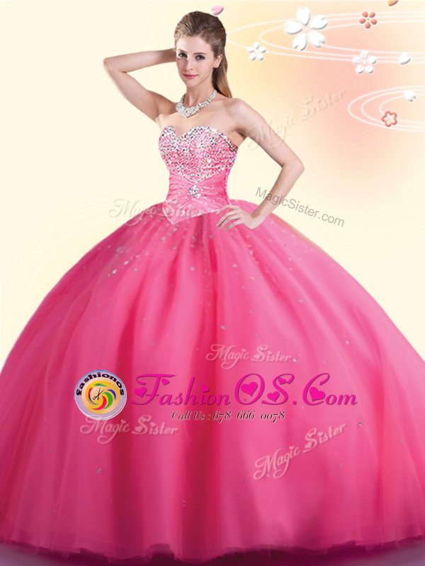 Hot Pink Sleeveless Floor Length Beading Lace Up Vestidos de Quinceanera