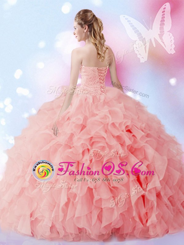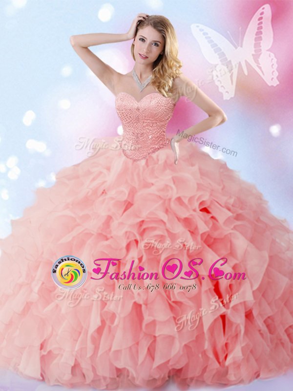 Suitable Watermelon Red Ball Gowns Organza Sweetheart Sleeveless Beading and Ruffles Floor Length Lace Up Vestidos de Quinceanera