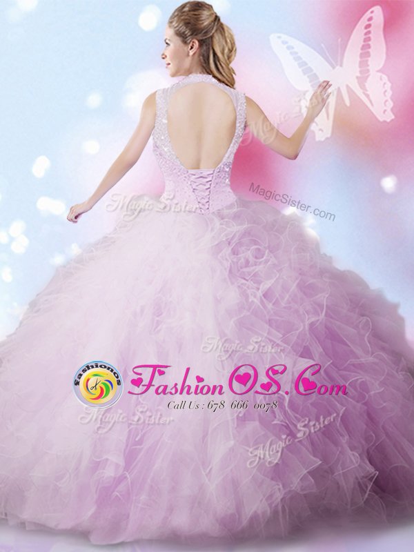Fashion Lavender Lace Up High-neck Beading and Ruffles Quinceanera Dresses Tulle Sleeveless