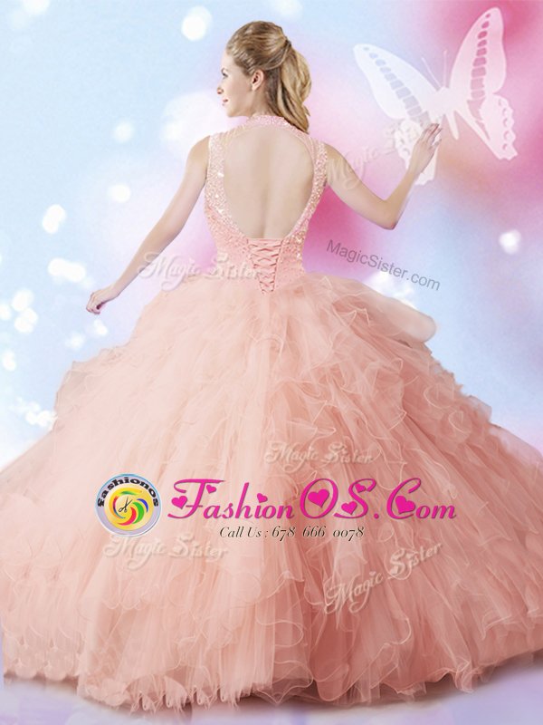 Floor Length Lace Up Quinceanera Dress Peach and In for Military Ball and Sweet 16 and Quinceanera with Beading and Ruffles