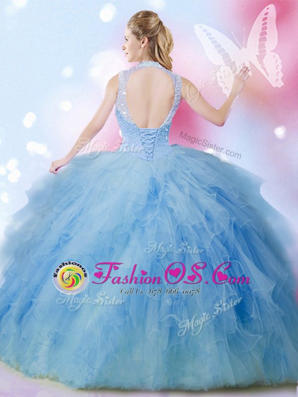 Beading and Ruffles Quinceanera Gown Baby Blue Lace Up Sleeveless Floor Length