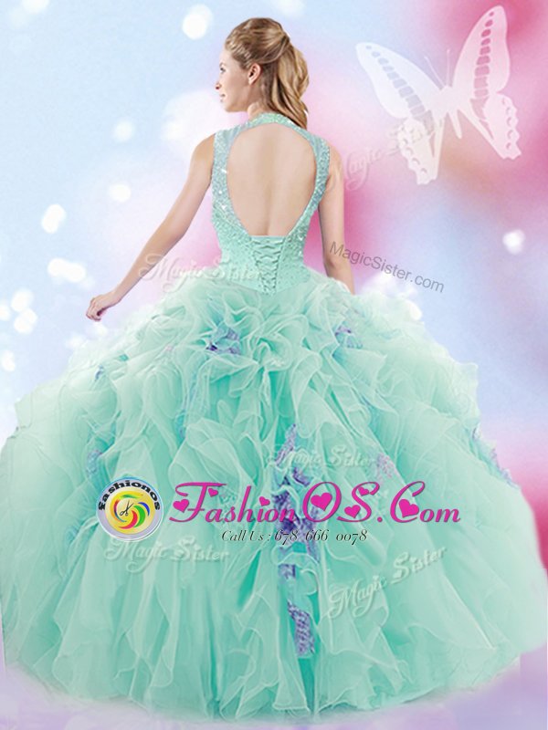 Halter Top Lilac Ball Gowns Beading and Ruffles 15th Birthday Dress Lace Up Tulle Sleeveless Floor Length
