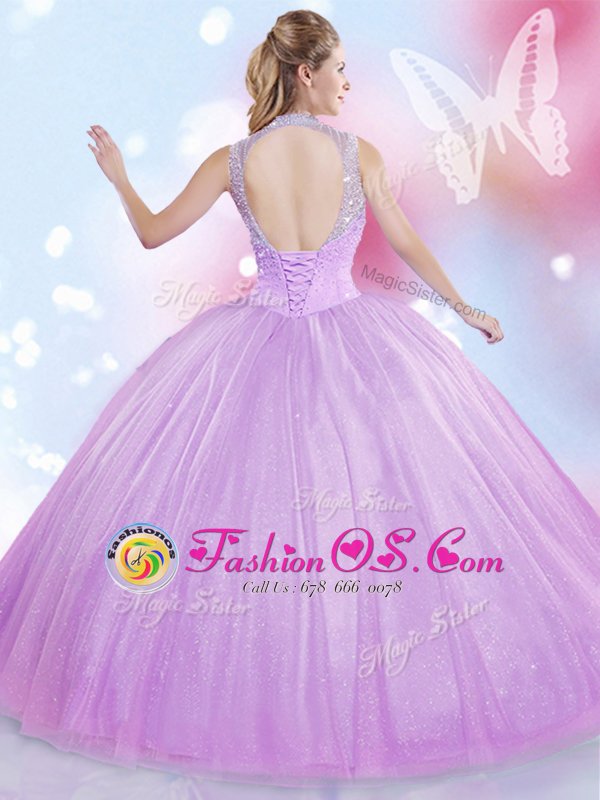 High-neck Sleeveless Lace Up Sweet 16 Dresses Lavender Tulle