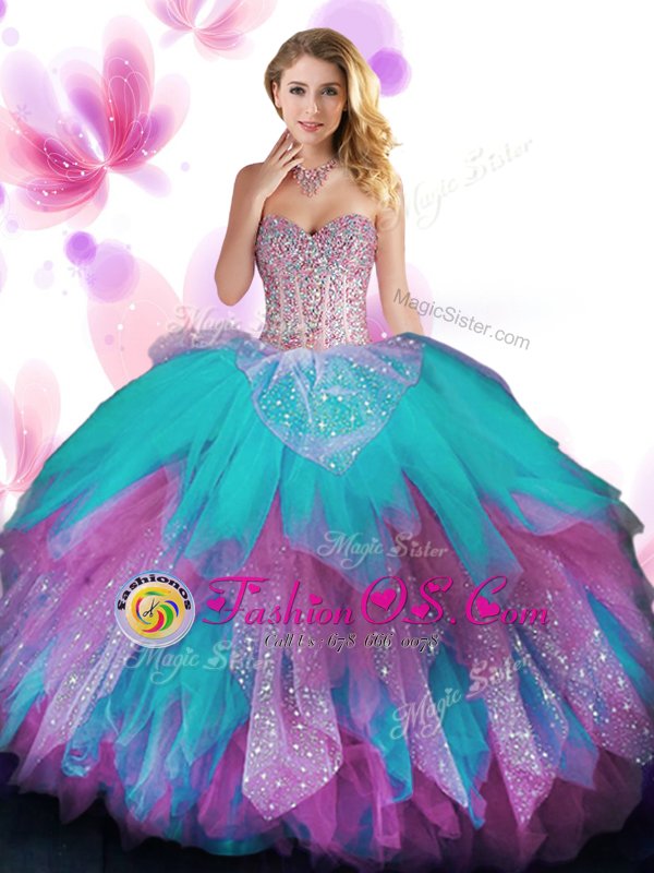 Lovely Tulle Sleeveless Floor Length 15 Quinceanera Dress and Beading and Ruffled Layers