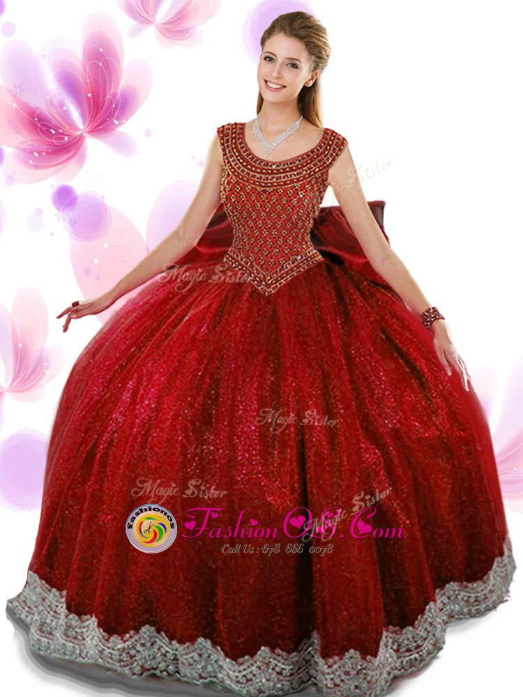 Wine Red Scoop Neckline Beading and Appliques and Bowknot Quinceanera Gowns Sleeveless Zipper