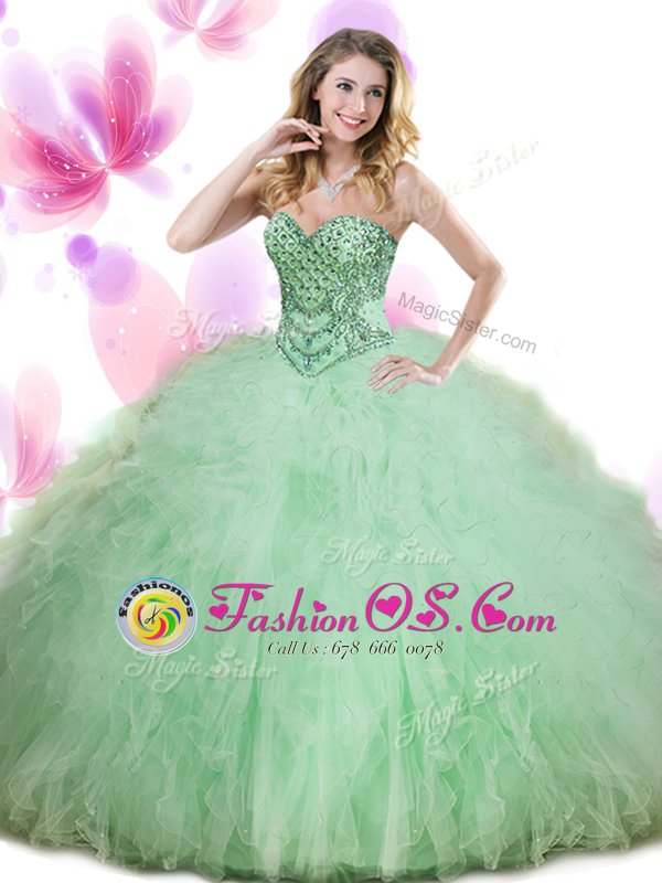 Apple Green Tulle Lace Up Vestidos de Quinceanera Sleeveless Floor Length Beading and Ruffles
