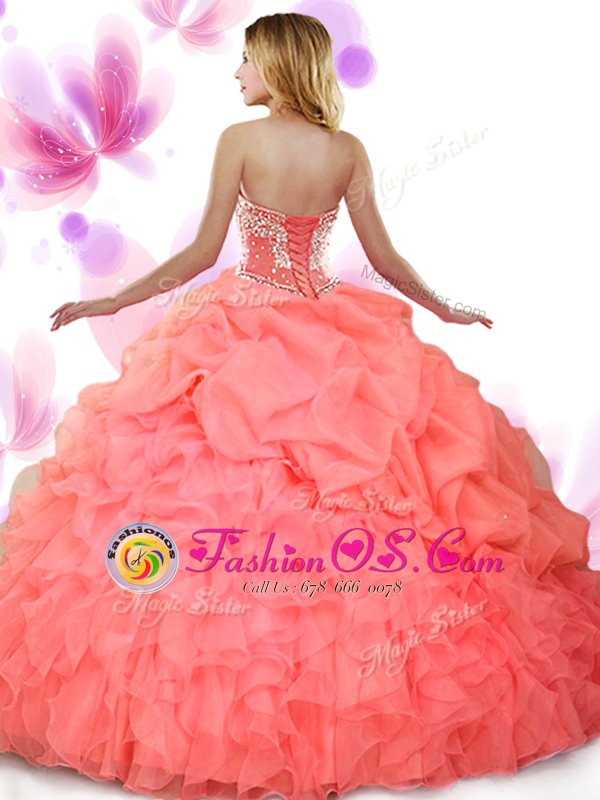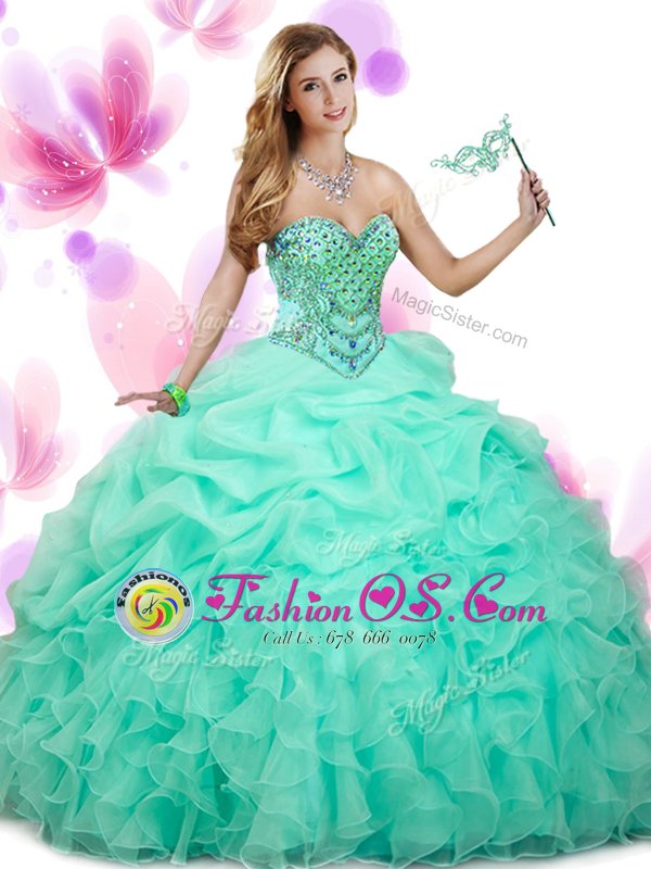 Graceful Floor Length Apple Green Ball Gown Prom Dress Organza Sleeveless Beading and Ruffles and Pick Ups