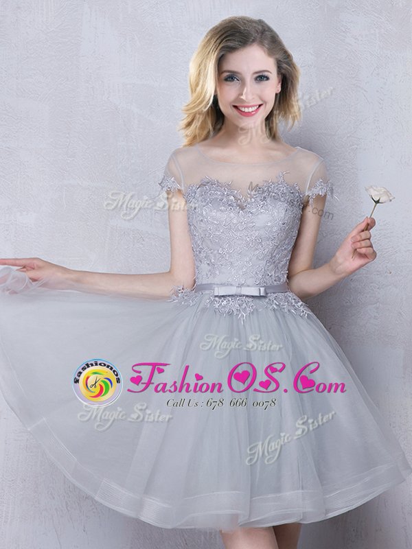 A-line Quinceanera Court of Honor Dress Grey Scoop Tulle Short Sleeves Mini Length Lace Up