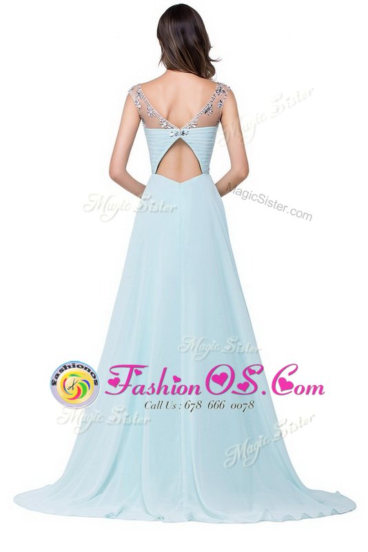 Scoop Light Blue Chiffon Zipper Evening Dress Sleeveless With Brush Train Beading