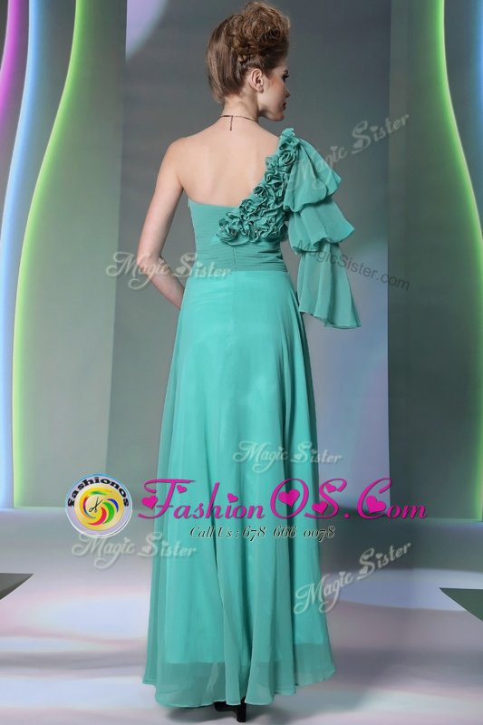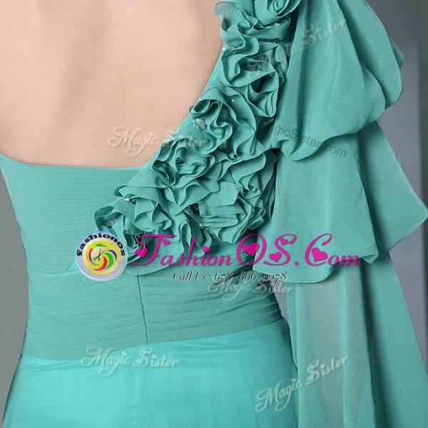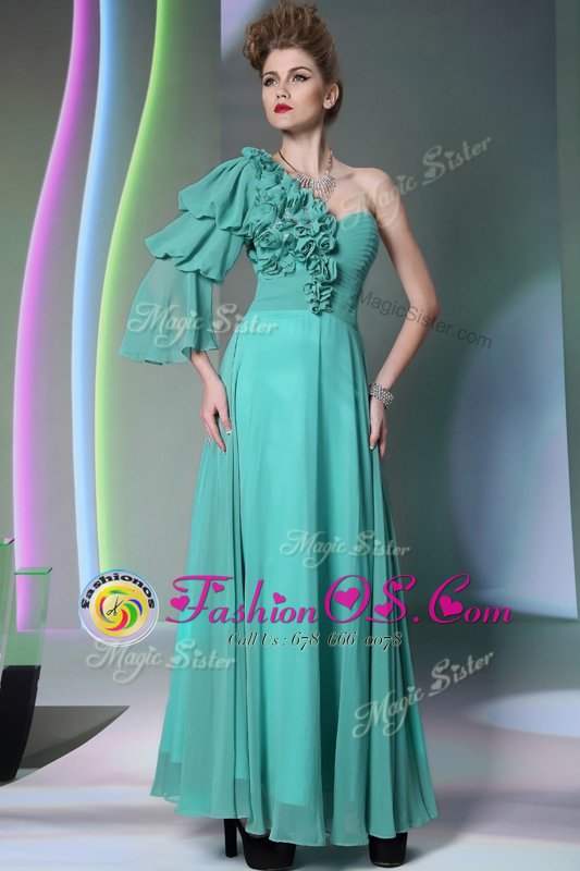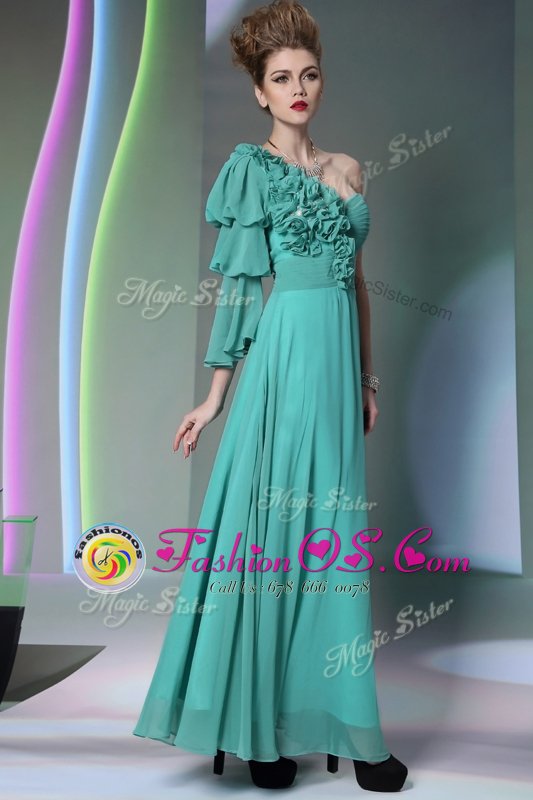 One Shoulder Ruffles and Ruching Prom Gown Turquoise Zipper Long Sleeves Floor Length