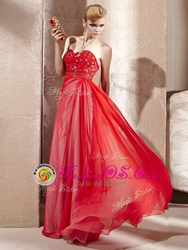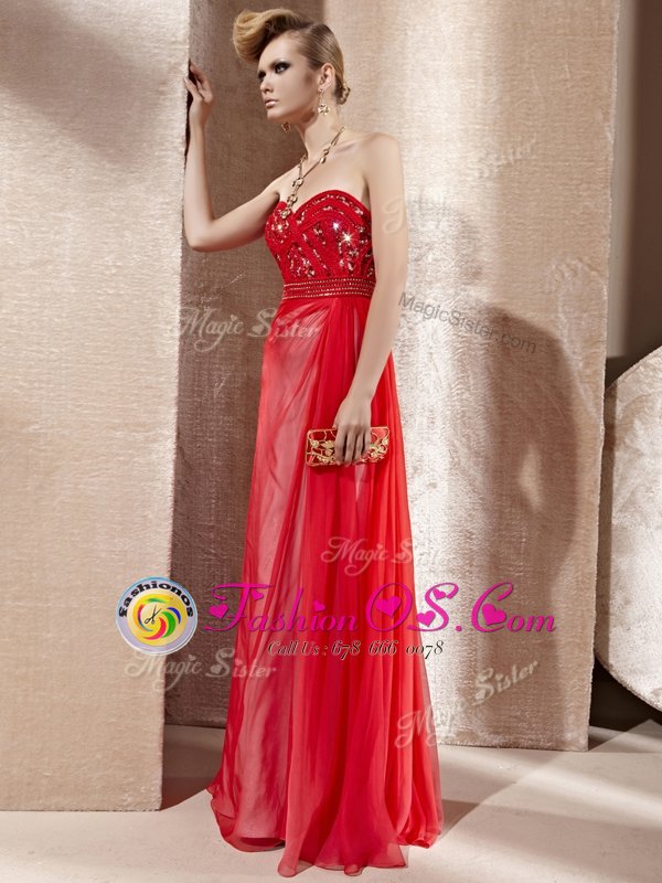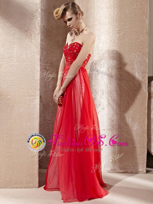Chic Coral Red Column/Sheath Beading Evening Dress Side Zipper Chiffon Sleeveless Floor Length