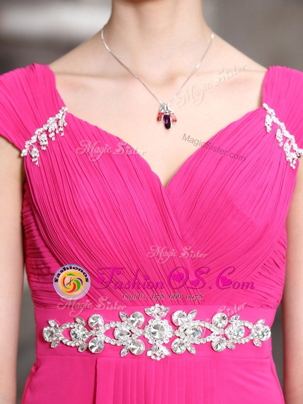 V-neck Sleeveless Dress for Prom Floor Length Beading Hot Pink Chiffon
