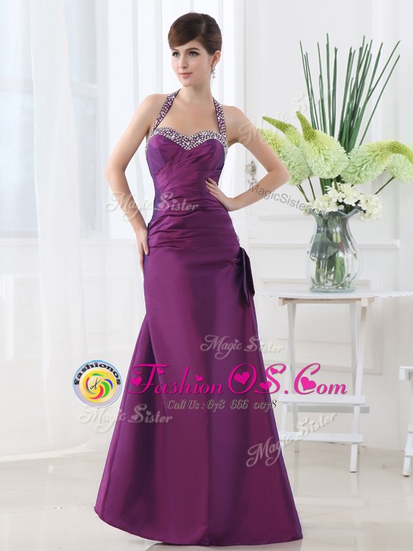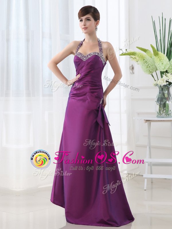 Fashion Halter Top Purple Lace Up Prom Party Dress Beading and Ruching Sleeveless Floor Length