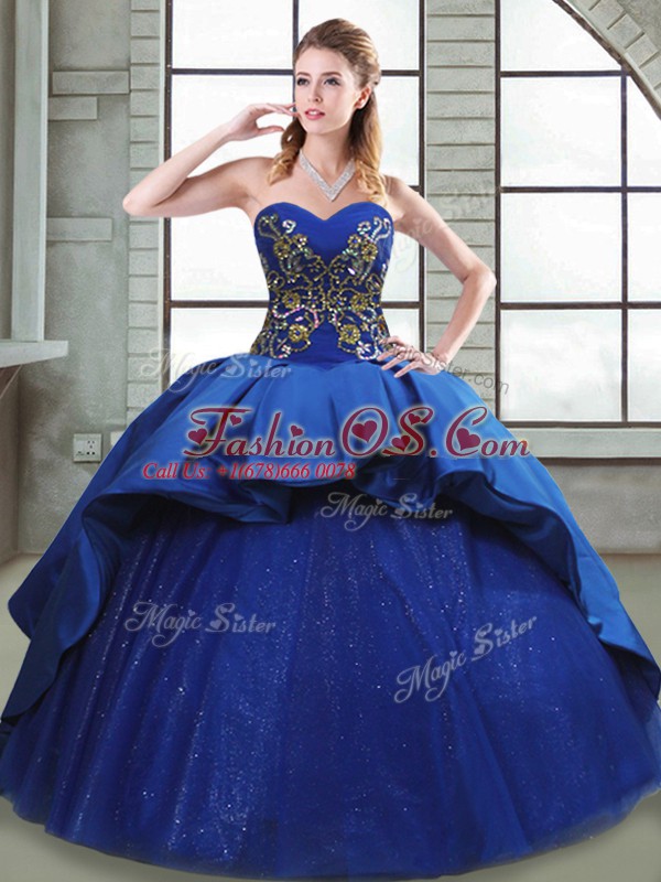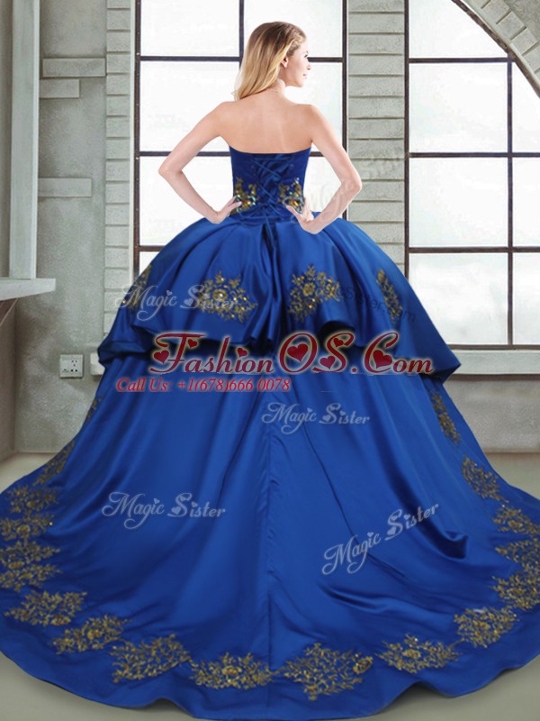 New Style Sleeveless Taffeta Court Train Lace Up Vestidos de Quinceanera in Blue with Beading and Appliques and Embroidery