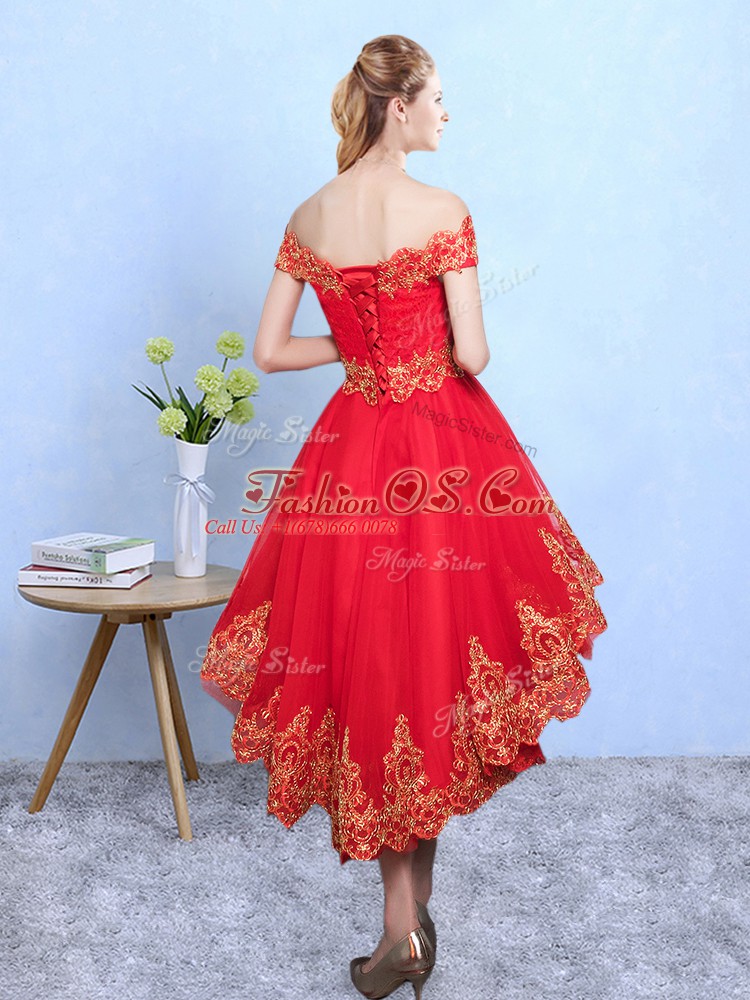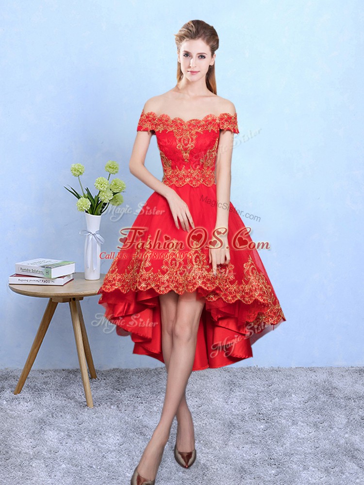 Wine Red Tulle Lace Up Bridesmaid Gown Sleeveless High Low Appliques