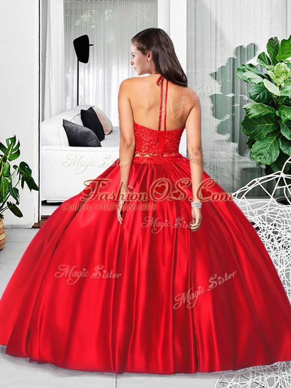 Beautiful Halter Top Sleeveless Quinceanera Gowns Floor Length Lace and Ruching Wine Red Taffeta